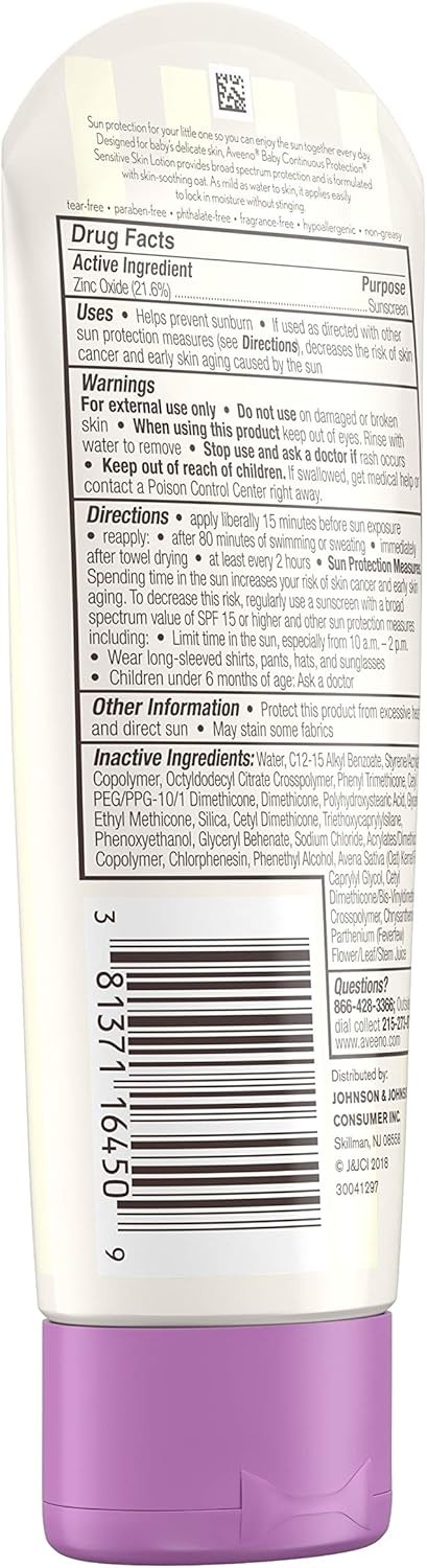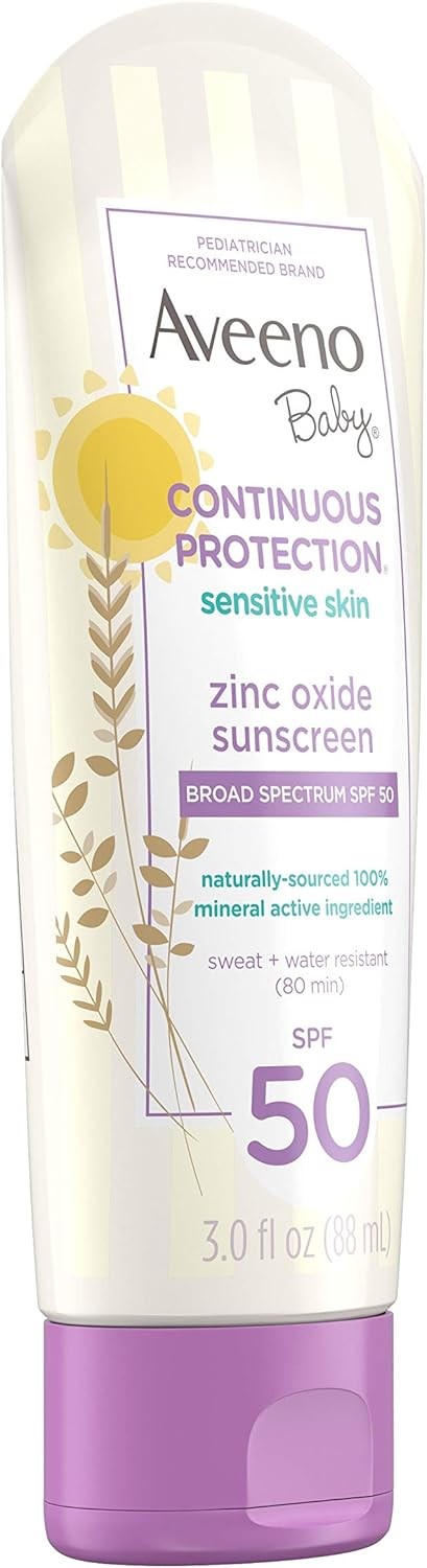 • 3-fluid ounce tube of Aveeno Baby Continuous Protection Sensitive Skin Mineral Sunscreen Lotion with SPF 50 for superior broad spectrum protection from harmful UVA and UVB rays for your little one's skin