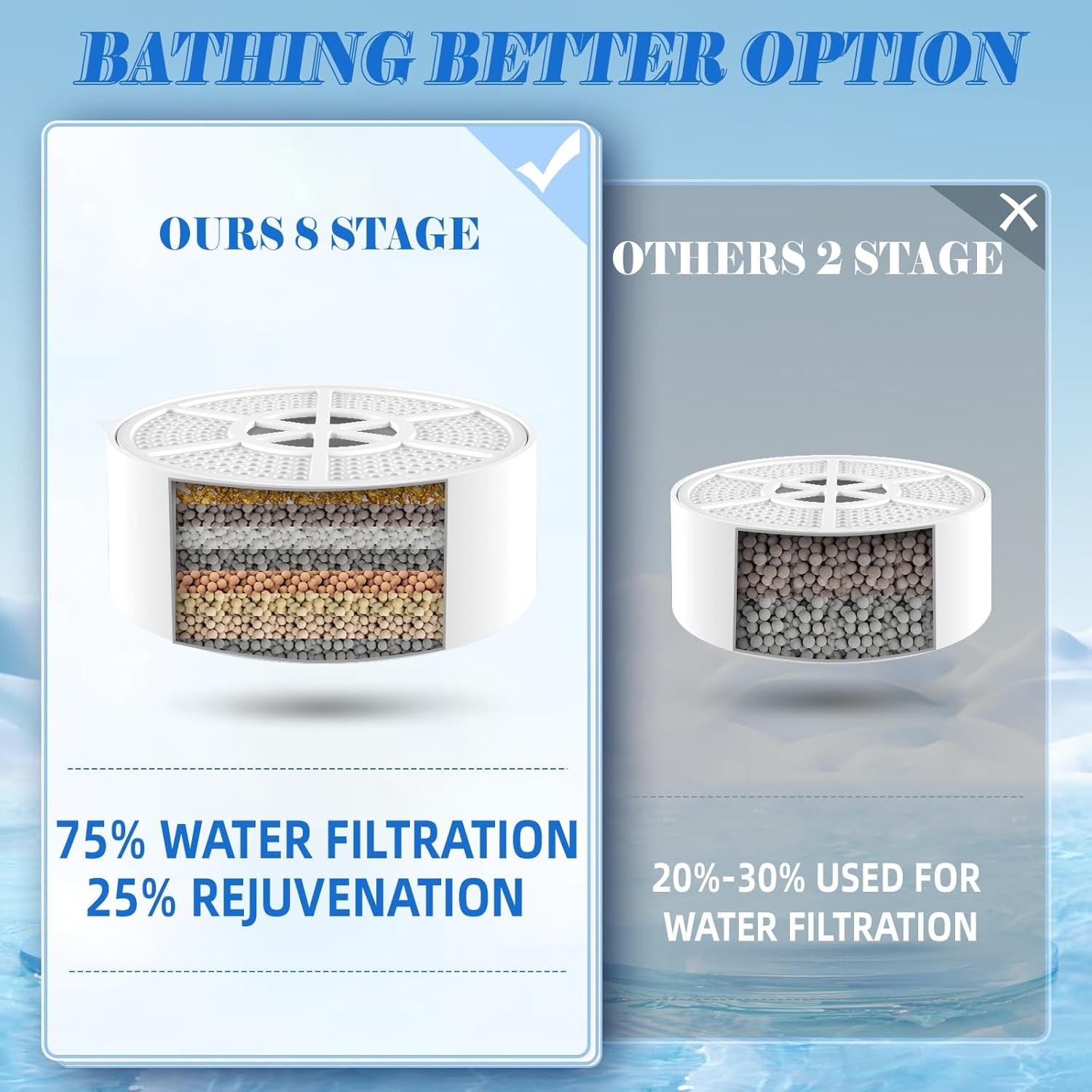 • High-Efficiency Filtration - This bath water filter does not contain BPA and uses 8 types of filter media to truly remove 99% of fluorine, chlorine, heavy metals, rust, and other harmful substances in the water step-by-step.