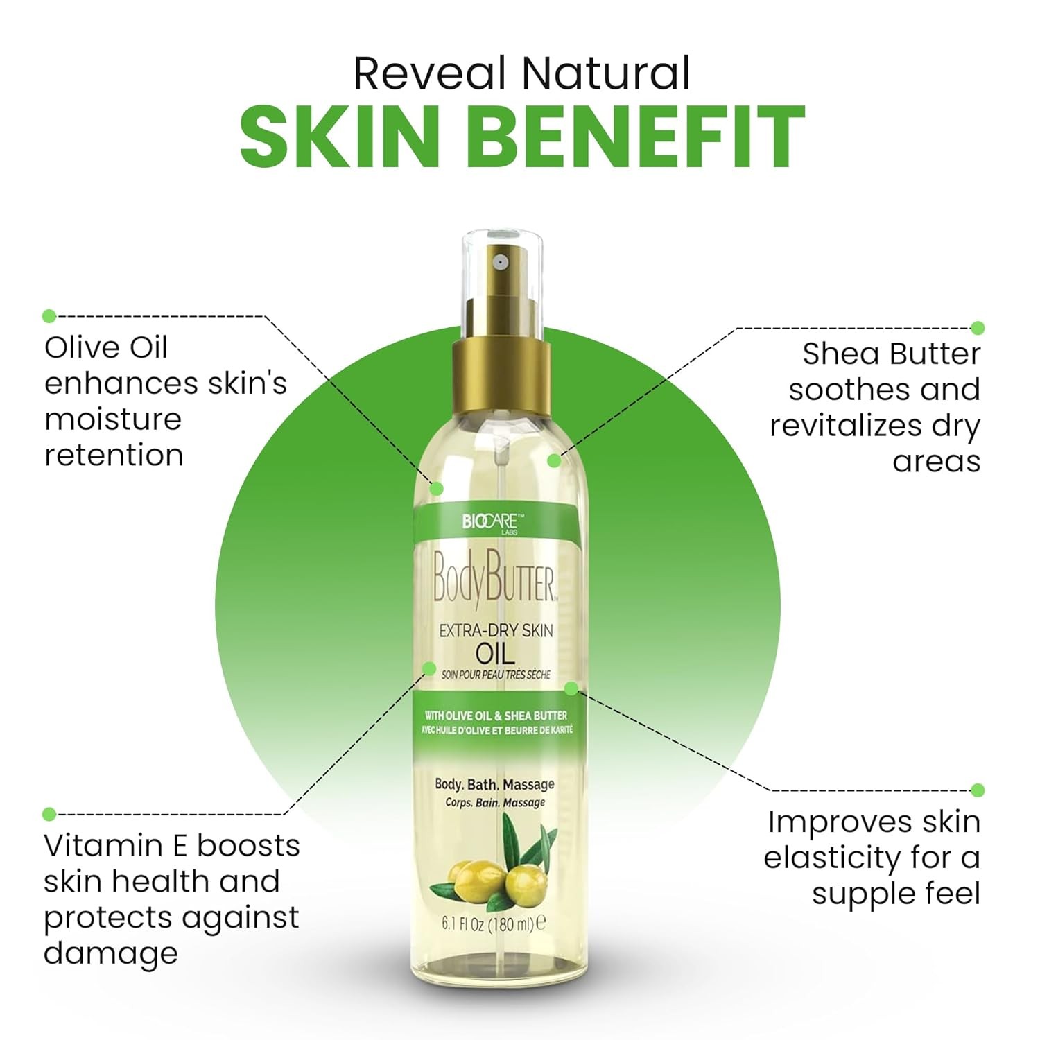 • HYDRATION & NOURISHMENT - Infused with Olive Oil and Shea Butter, this moisturizing body oil targets extra dry skin, offering deep hydration and nourishment. Ideal for daily use, it leaves skin soft without a greasy residue.