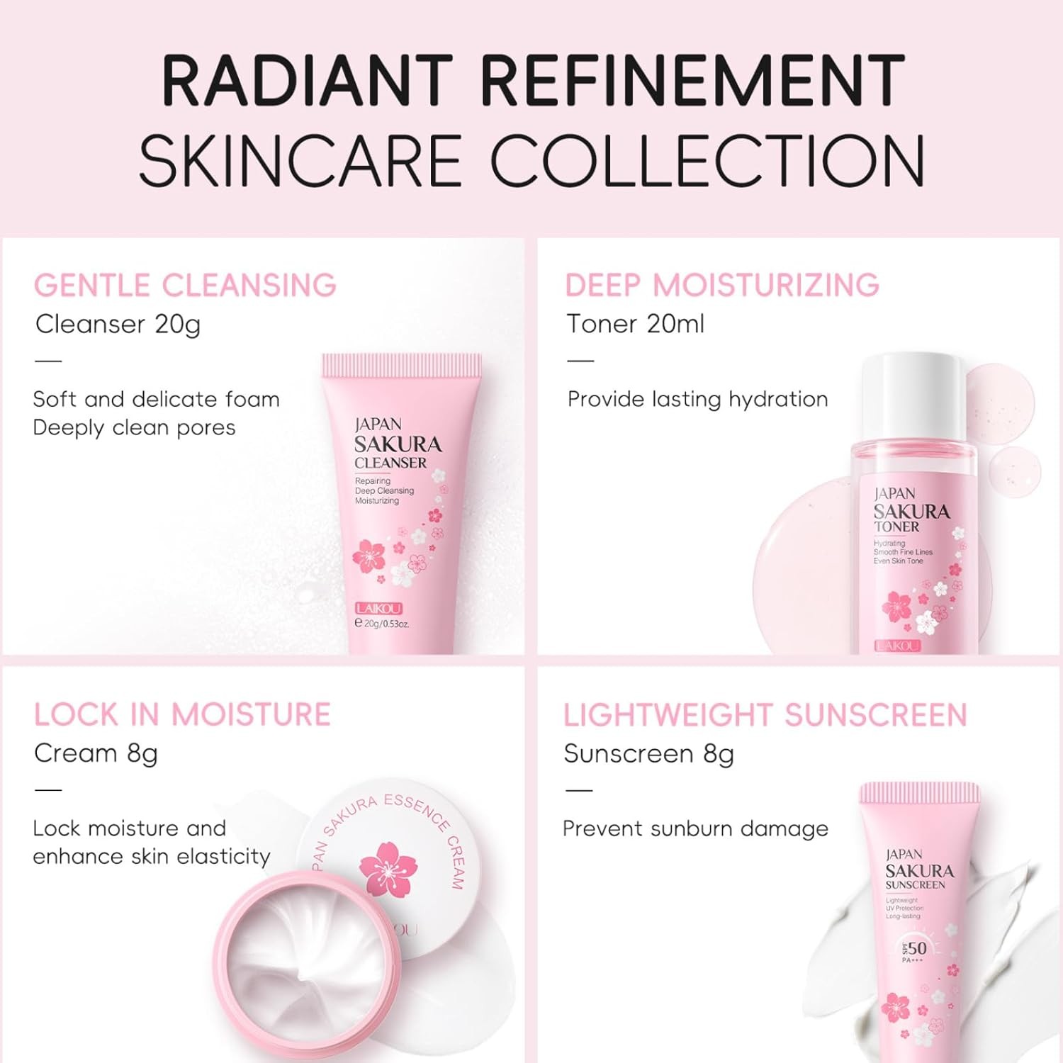 Skincare Kit Sakura Teen Girls Gifts Women - Skin Care Set Travel Size Toiletries - Skincare for Girls 10-12 Hydrating - Gift Set for Women with Cleanser,Serum,Cream,Sunscreen,Moisture Gel,Mask(12pcs)