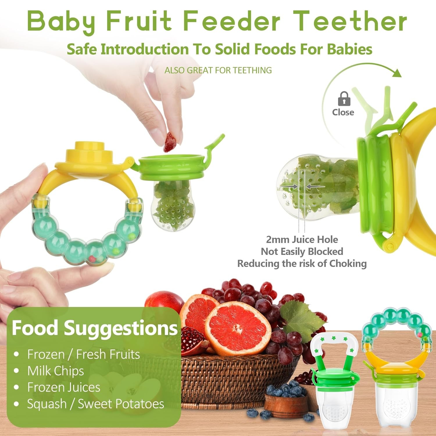 • 【 MULTI-FUNCTIONAL-Safely Introduce Solids】: Baby food feeder pacifier-a perfect way to introduce solid to baby, soft silicone food pouch with 2mm small holes only allow small, digestible pieces to pass through to ensure safe feeding. Just put frozen fruits,vegetables, meat fish or frozen pieces, frozen breastmilk, your baby will enjoy tasting, sucking and chewing on.