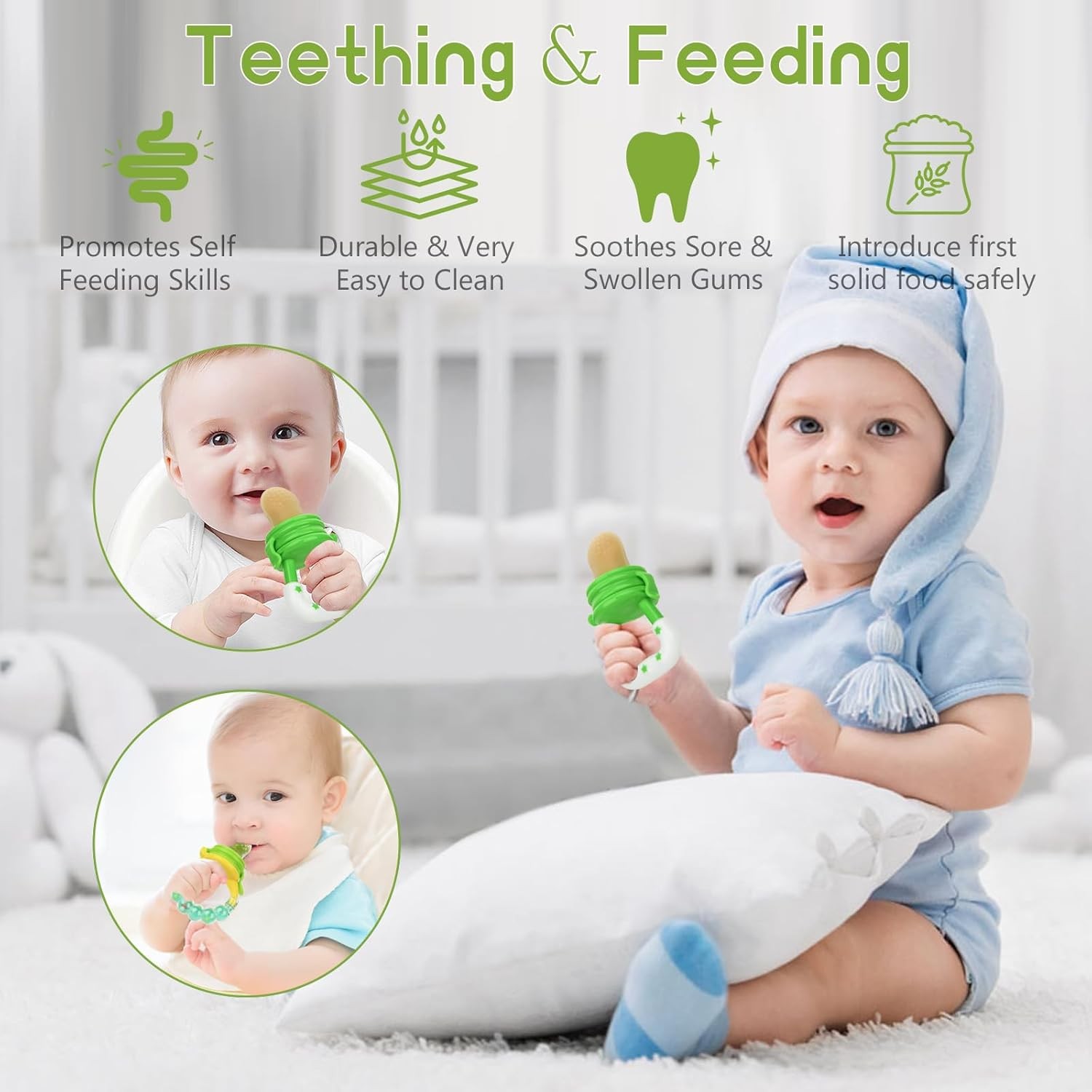 • 【Easy to Clean】: WAJIAYON baby food/fruit feeder all parts are able to be taken apart for washing, every corner can be washed. Silicone infant feeder, steam/microwave/boil safe.